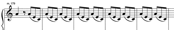 hands—adapting the passage by changing the notes of the right hand to an arpeggiated, first inversion A minor triad. With the dramatically surging left hand and